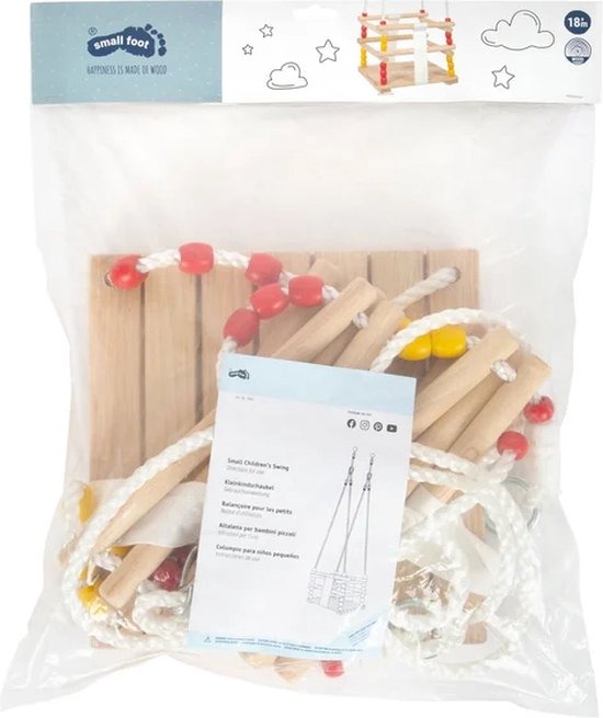 De Small Foot peuterschommel wordt geleverd met een duidelijke handleiding en alle benodigde bevestigingsmaterialen. De montage duurt ongeveer 30 minuten en kan door één persoon worden uitgevoerd. De verstelbare touwen (150cm lang) maken het mogelijk om de schommel op de perfecte hoogte te hangen, zowel binnen als buiten.
