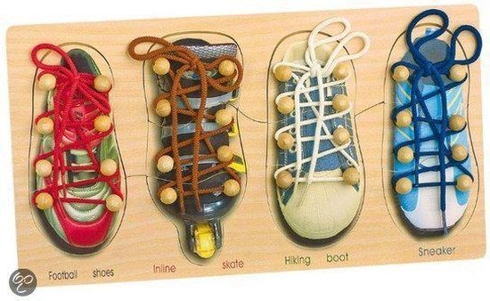 Leer Om op een leuke speelse manier te leren strikken en om te gaan met schoenveters. Deze set bestaat uit bord met vier verschillende soorten 'schoenen' voorzien van veters. Afmetingen bord: ca. 40 x 22 cm